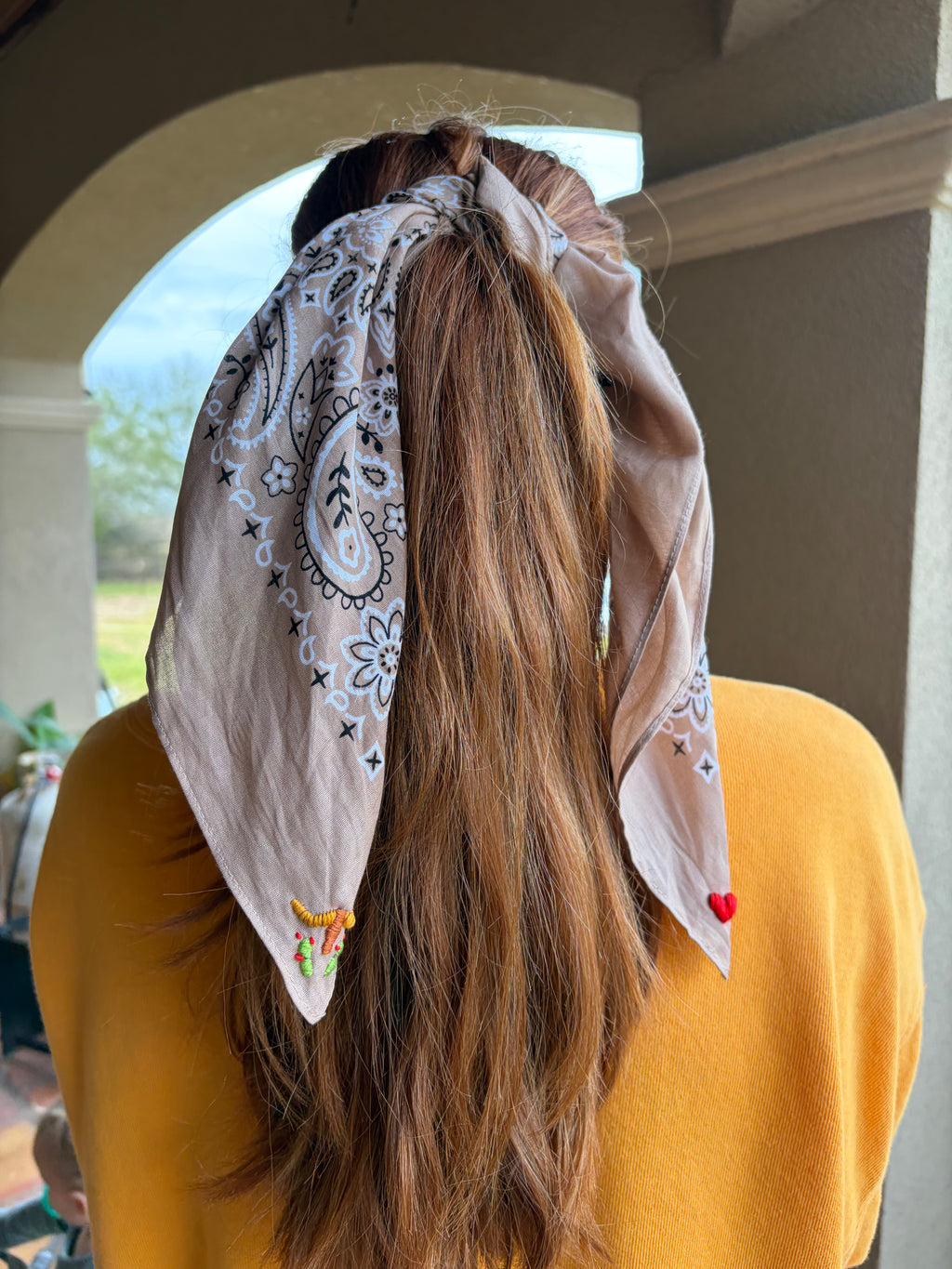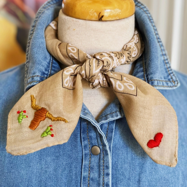 Inspired by the spirit of Texas, the Embroidered Cattle Call Bandana features a hand-embroidered longhorn—an iconic symbol of the Lone Star State. Each bandana is individually hand drawn and stitched, making every piece truly one of a kind.